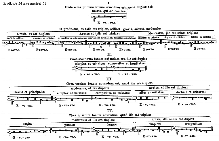 [71] [Szydlovite, Musica magistri, 71; text: I. II. III. IV. Unde circa primum tonum sciendum est, quod duplex est: Brevis, qui sic canitur: Evovae. Et productus, et talis est triplex, scilicet: gravis, acutus, moderatus: Gravis, et est duplex: Acutus et talis est triplex: Moderatus, ille est eciam triplex: declinis scilicet: elevatus et usitatus: circumflexus et inusitatus: compositus et usitatus: simplex et usitatus: duplus et usitatus: triplus et usitatus: Circa secundum tonum notandum est, ille est duplex: compositus et inusitatus: Circa tercium tonum notandum est, quod ille est triplex: moderatus, et est duplex: Gravis et principalis: altus et usitatus: declinis et usitatus: Circa quartum tonum notandum, quod ille est triplex: moderatus et ille est duplex: ille eciam est duplex: parcus: largus: simplex: compositus:] [SZYDMUS 37GF]