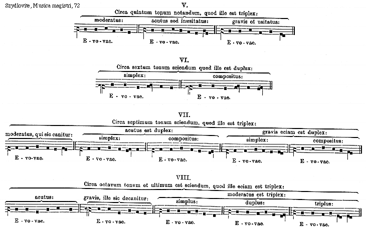 [72] [Szydlovite, Musica magistri, 72; text: V. VI. VII. VIII. Circa quintum tonum notandum, quod ille est triplex: moderatus: acutus sed inusitatus: gravis et usitatus: Evovae. Circa sextum tonum sciendum quod ille est duplex: simplex: compositus: Circa septimum tonum sciendum, quod ille est triplex: acutus est duplex: gravis eciam est duplex: moderatus, qui sic canitur: Circa octavum tonum et ultimum est sciendum, quod ille eciam est triplex: moderatus est triplex: acutus: gravis, ille sic decanitur: simplus: duplus: triplus:] [SZYDMUS 38GF]