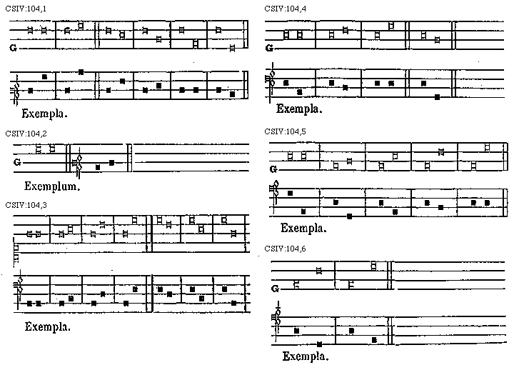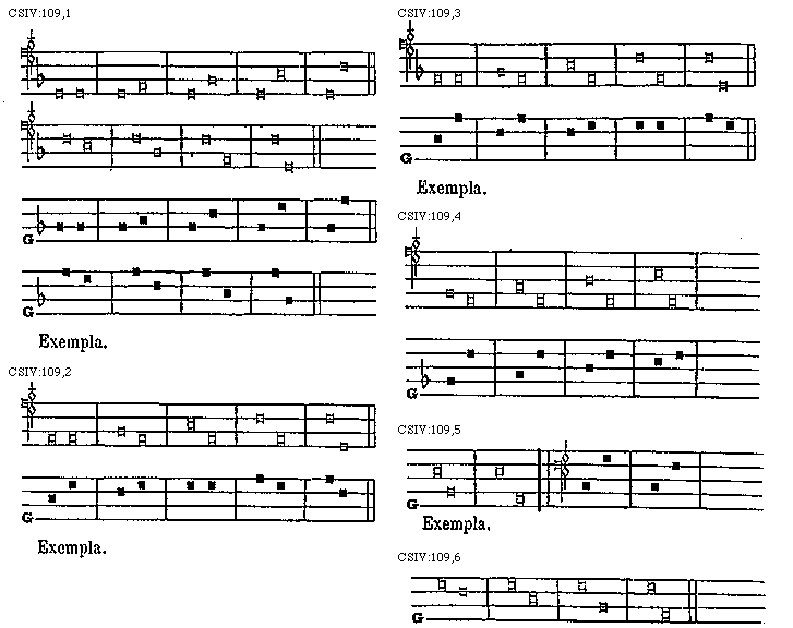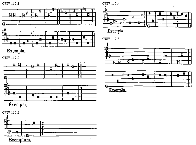 Sed si tenor unum gradum tantum aut duos, aut tres, aut quatuor ascendat, unisonus post se infra eum tantummodo quintam requirit; quae quidem quinta unisonum hunc supra tenorem solummodo sequetur, si tot gradus, hoc est unum, duo, tres aut quatuor tenor ipse descendat, ut hic probatur: