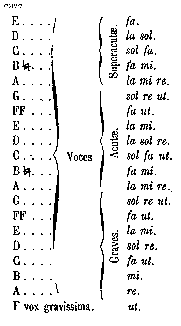 [CSIV:5; text: Figura: Claves. Superacutae. e...E la. d... D la sol. c...C sol fa. b [sqb]...b fa [sqb] mi. a...A la mi re. Super acutum. Acutae. G...G sol re ut. FF...F fa ut. E...E la mi. Acutum. D...D la sol re. C...C sol fa ut. B [sqb]...B fa [sqb] mi. A...A la mi re. Acutum. Graves. G...G sol re ut. F...FF fa ut. Grave. E...E la mi. D...D sol re. C...C fa ut. B...B mi. A...A re. Clavis gravissima. [Gamma]...[Gamma] ut.] [TINEXP 02GF]