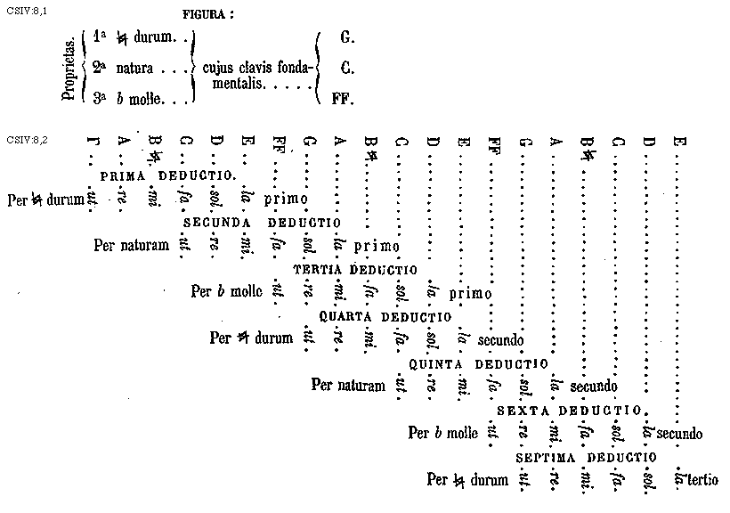 Sex in C sol fa ut, scilicet sol fa, fa sol; sol ut, ut sol; fa ut, ut fa: sol fa ad descendendum de b molli in [sqb] durum; fa sol ad descendendum de [sqb] duro in b molle; sol ut ad ascendendum a b molli in naturam; ut sol ad descendendum de natura in b molle; fa ut ad ascendendum a [sqb] duro in naturam; ut fa ad descendendum de natura in [sqb] durum, ut hic patet: