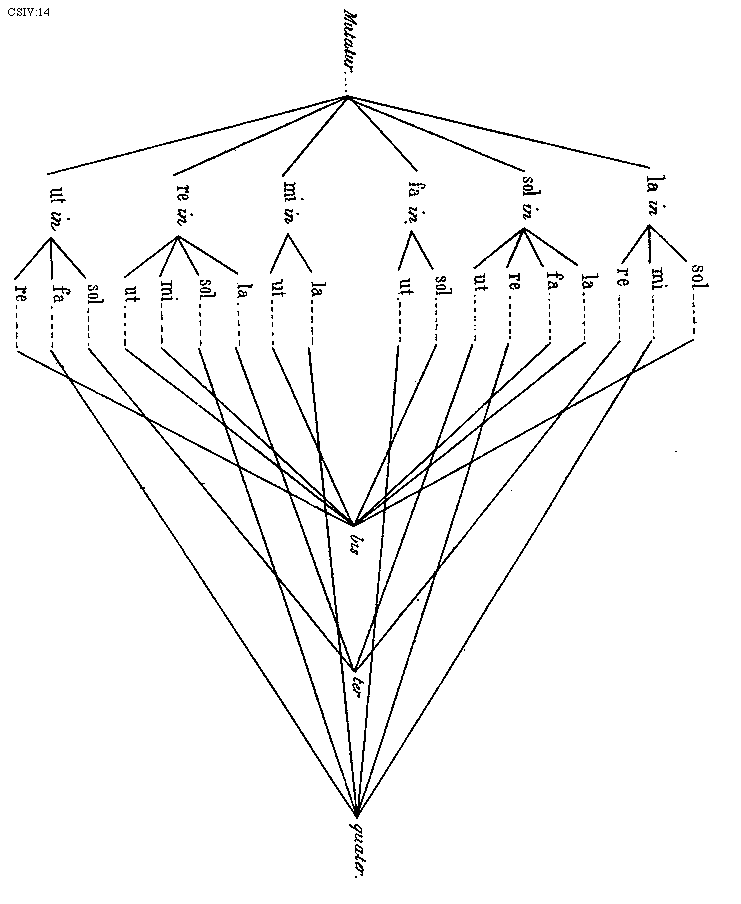 [14] [CSIV:14; text: Mutatur...la in sol mi re sol in la fa re ut fa in sol ut mi in la ut re in la sol mi ut ut in sol fa re bis ter quater.] [TINEXP 07GF]
