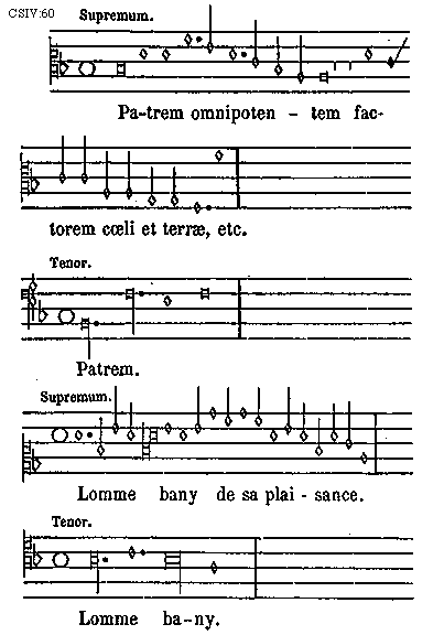 [CSIV: 60; text: Supremum. Patrem omnipotentem factorem coeli et terrae, etc. Tenor. Patrem. Lomme bany de sa plaisance. Lomme bany.] [TINLIB 01GF]