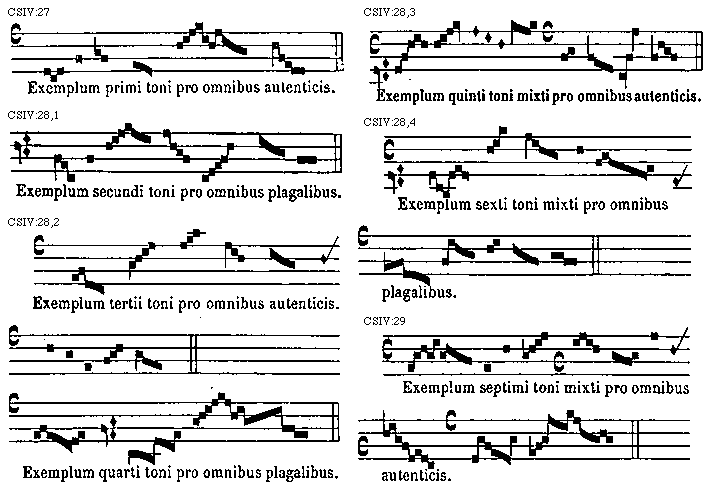 [CSIV:36,2; text: Exemplum primi toni mixti pro omnibus autenticis. Exemplum secundi toni mixti pro omnibus plagalibus.] [TINNAT 11GF]