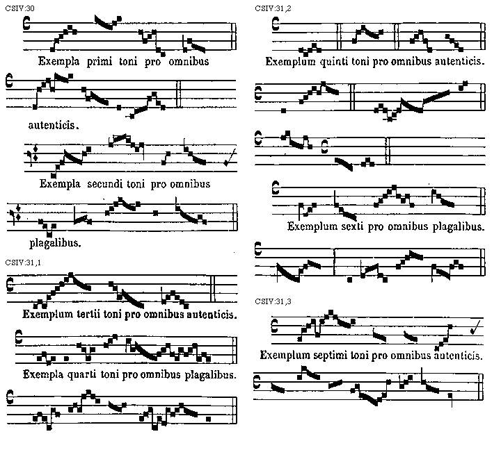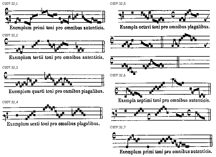 [CSIV:33,5; text: Exemplum primi toni pro omnibus autenticis. Exemplum secundi toni pro omnibus plagalibus.] [TINNAT 08GF]