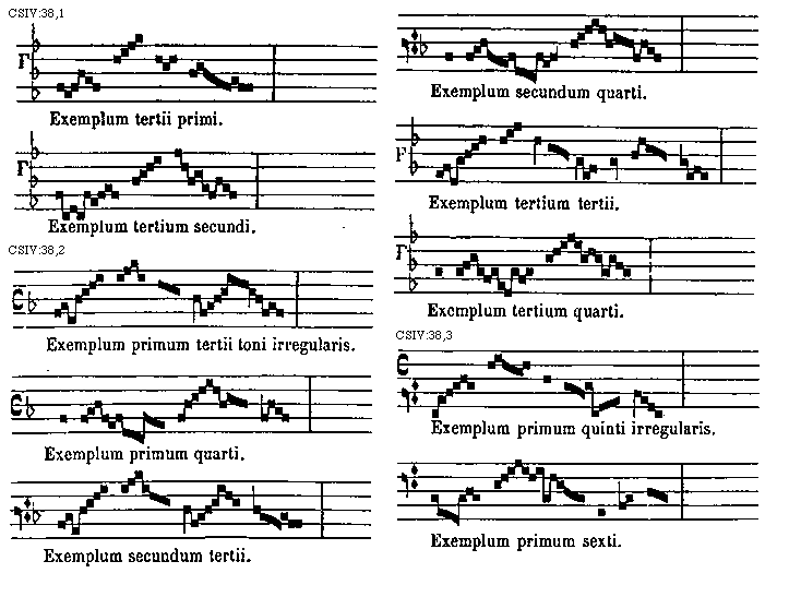 [CSIV:38,2; text: Exemplum primum tertii toni irregularis. Exemplum primum quarti. Exemplum secundum tertii. Exemplum secundum quarti. Exemplum tertium tertii. Exemplum tertium quarti.] [TINNAT 13GF]