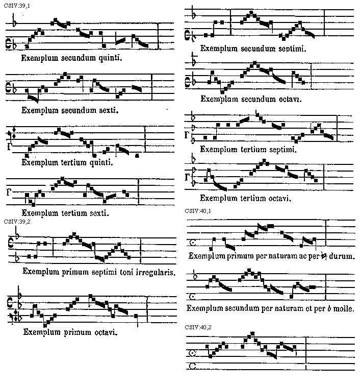[CSIV:39,2; text: Exemplum primum septimi toni irregularis. Exemplum primum octavi. Exemplum secundum septimi. Exemplum secundum octavi. Exemplum tertium septimi. Exemplum tertium octavi.] [TINNAT 14GF]