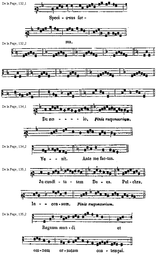 [De La Fage, 135,1; text: Jucunditatem Deus. Pulchra. Incensum. Finis responsorium.] [UGOMUS 02GF]