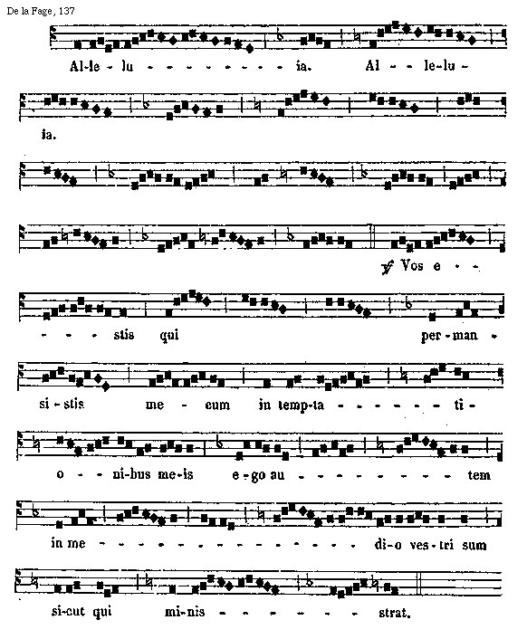 [De La Fage, 137; text: Alleluia. Versus Vos estis qui permansistis mecum in temptationibus meis ego autem in medio vestri sum sicut qui ministrat.] [UGOMUS 03GF]