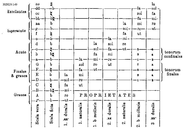 [MfM29:149; text: Excellentes, Superacute, Acute, Finales et graues, Graues, Scala vera, Scala ficta, [sqb] duralis, naturalis, b mollaris, tonorum confinales, tonorum finales, proprietates, [Gamma], A, B, C, D, E, F, G, a, b, c, d, e, f, g, aa, bb, cc, dd, ee, b[sqb], ut, re, mi, fa, sol, la, 1. 2. 3, 4, 5, 6, 7, 8] [ANOLEIP 01GF]