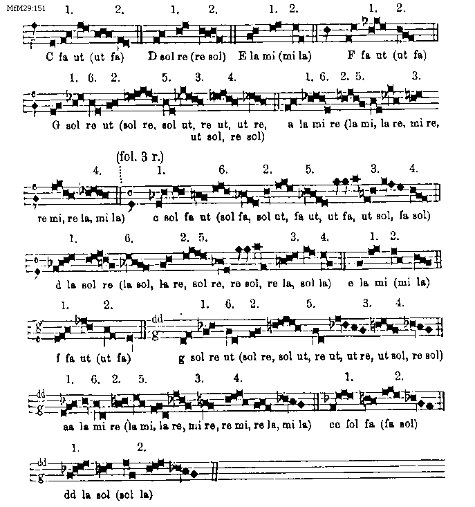 [MfM29:151; text: 1. 2. 3. 4. 5. 6. C fa ut, (ut fa), D sol re, (re sol), E la mi, (mi la), F fa ut (ut fa), G sol re ut, (sol ut, re ut, ut re, ut sol), a la mi re, (la re, mi re, re mi, re la, ), c sol fa ut, (sol fa, fa sol), d la sol re, (la sol, sol la), e la mi, f fa ut, g sol re ut, aa la mi re, cc sol fa, dd la sol, (fol. 3 r.)] [ANOLEIP 02GF]