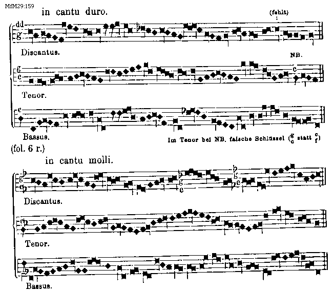 [159] [MfM29:159; text: Vocum mutationes. in cantu duro. in cantu molli. Discantus. Tenor. Bassus. (fol. 6 r.)] [ANOLEIP 04GF]