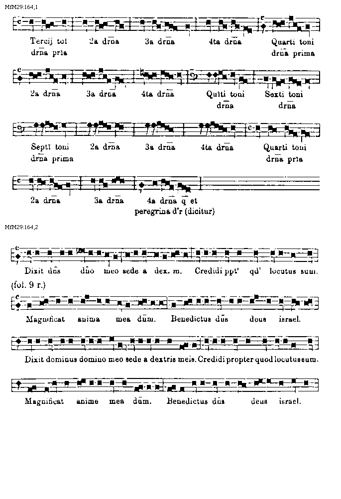 [MfM29:164,2; text: Dixit dominus domino meo sede a dextris meis. Credidi propter quod locutus sum. Magnificat anima mea dominum. Benedictus dominus deus israel. anime, (fol. 9 r.), secundus] [ANOLEIP 07GF]