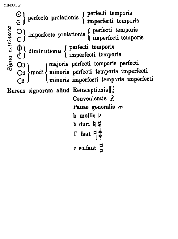 [MfM30:5,2; text: Signa extrinseca, perfecte prolationis, imperfecte prolationis, diminutionis, perfecti temporis, imperfecti temporis, modi, majoris perfecti temporis perfecti, minoris perfecti temporis imperfecti, minoris imperfecti temporis imperfecti, Rursus signorum aliud Reinceptionis, Convenientie, Pause generalis, b mollis, b duri, F faut, c solfaut] [ANOLEIP 11GF]