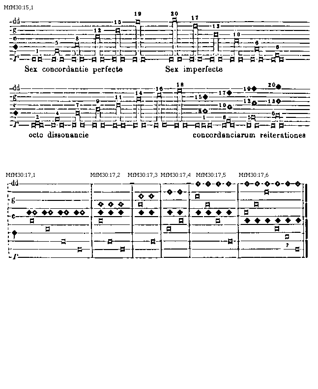 [MfM30:15,1; text: Sex concordantie perfecte, Sex imperfecte, octo dissonancie, concordanciarum reiterationes, 1, 2, 3, 4, 5, 6, 7, 8, 9, 10, 11, 12, 13, 14, 15, 16, 17, 18, 19, 20, c, g, dd, [Gamma]] [ANOLEIP 13GF]