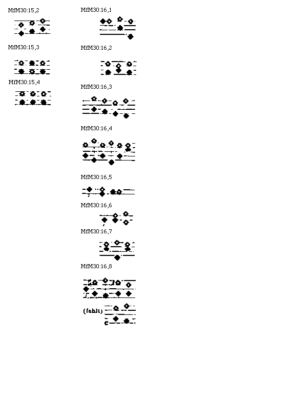 Verum nunquam plures sexte ascendentes possunt in contrapuncto simplici constitui. complures tamen descendentes possunt consequenter et immediate disponi. dummodo vltimam sequatur octaua quam requirit vt hic [MfM30:16,3] [ANOLEIP 14GF]. poterit tamen eam etiam sequi decima tenore remisso per quartam vel terciam. similiter poterit eam sequi tercia tenore ascendente in quartam hoc modo [MfM30:16,4] [ANOLEIP 14GF].