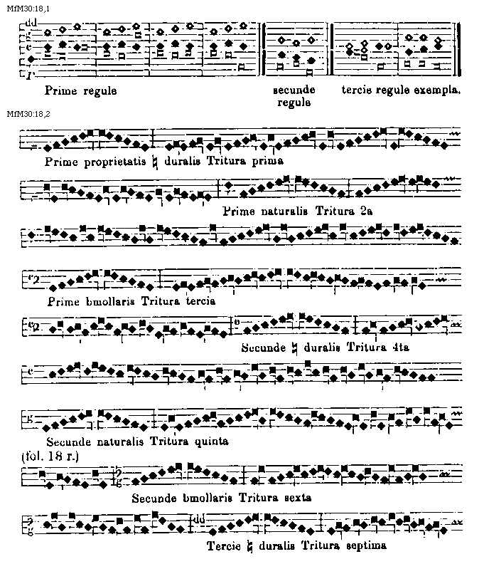 [MfM30:18,2; text: Prime proprietatis [sqb] duralis Tritura prima, Prime naturalis Tritura secunda, Prime bmollaris Tritura tercia, Secunde [sqb] duralis Tritura quarta, Secunde naturalis Tritura quinta, (fol. 18 r.), Secunde bmollaris Tritura sexta, Tercie [sqb] duralis Tritura septima, c, g, dd, [Gamma], [rob]] [ANOLEIP 15GF]
