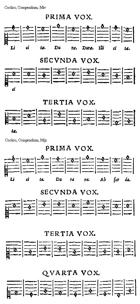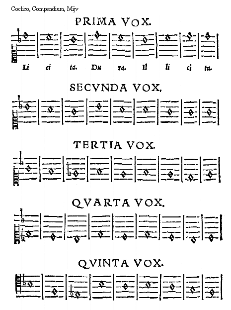 [Coclico, Compendium, Mijr; text: PRIMA VOX. SECVNDA VOX. TERTIA VOX. QVARTA VOX. Licita. Dura. Absurda.] [COCCOM 51GF]