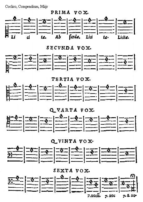 [Coclico, Compendium, Mijv; text: PRIMA VOX. SECVNDA VOX. TERTIA VOX. QVARTA VOX. QVINTA VOX. Licita. Dura. Illicita.] [COCCOM 52GF]