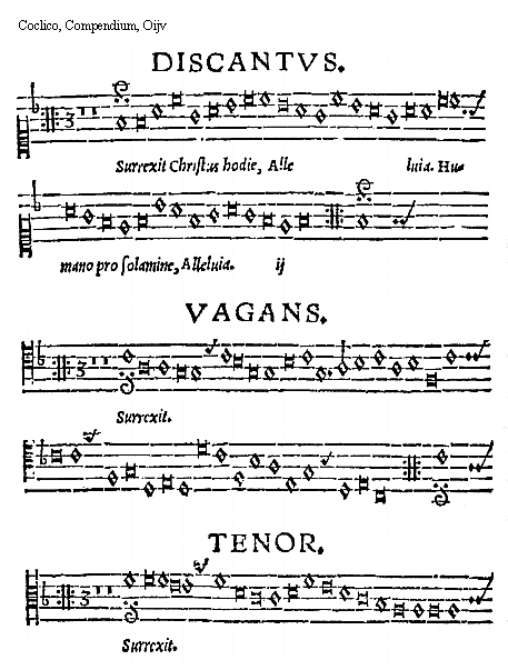 [Coclico, Compendium, Oijv; text: DISCANTVS. VAGANS. TENOR. Surrexit Christus hodie, Alleluia. Humano pro solamine, Alleluia. ij, 3] [COCCOM 64GF]