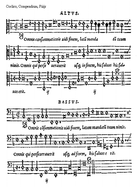 [f.Piiijr] [Coclico, Compendium, Piiijr; text: ALTVS. BASSVS. Omnis consummationis uidi finem, latum mandatum tuum nimis. Omnis qui perseuerauerit usque in finem, hic saluus erit. ij] [COCCOM 73GF]