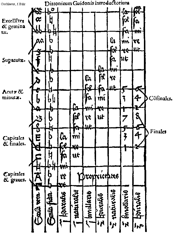[f.Biiir] [Cochlaeus, f.Biiir; text: Diatonicum Guidonis introductorium, Excellentes et geminatae. Superacutae. Acutae et minutae. Capitales et finales. Capitales et graues. Confinalcs. Finales, [Gamma], A, [sqb], C, D, E, F, G, a, b, c, d, e, f, g, aa, bb, cc, dd, ee, ut, re, mi, fa ut, sol re, la mi, sol re ut, la mi re, fa mi, sol fa ut, la sol re, sol fa, la sol, la, 1, 2, 3, 4, 5, 6, 7, 8, Proprietates, Scala vera, Scala ficta, primum [sqb]duralis, primum naturalis, primum bmollaris, secundum [sqb]duralis, secundum naturalis, secundum bmollaris, tertium [sqb]duralis] [COCTET2 02GF]