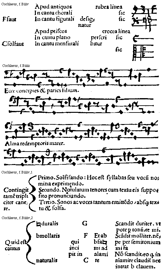 [Cochlaeus, f.Biiiiv,1; text: Contingit tamen tripliciter canere. Primo. Solfisando: Hoc est syllabas seu vocum nomina exprimendo. Secundo. Notularum tenores cum textu eis supposito pronunciando. Tertio. Sonos ac voces tantum emittendo, absque textu et solfa.] [COCTET2 03GF]