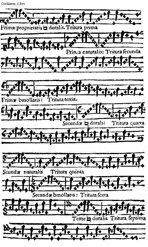 [f.Bvr] [Cochlaeus, f.Bvr; text: Primae proprietatis [sqb]duralis. Tritura prima, Primae naturalis: Tritura secunda, Primae bmollaris: Tritura tertia. Secundae [sqb]durals: Tritura quarta, Secundae naturalis, Tritura qninta, Secundae bmollaris: Tritura sexta, Tertie [sqb]duralis, Tritura septima] [COCTET2 04GF]