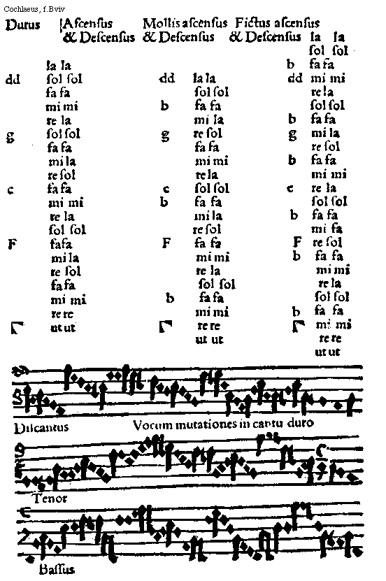 [Cochlaeus, f.Biiiiv,2; text: Quid est cantus [sqb]duralis, bmollaris, naturalis, qui incipit in G, F, C Et ab bfa[sqb]mi ad alamire Scandit duriter. vtpote per tonum, re mi. Scandit molliter. nempe per semitonium mi fa, Non scandit, eo quod in alamire clauditur nec intrat b clauem.] [COCTET2 03GF]