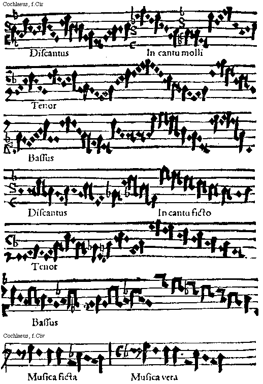 Committitur etiam saepe musica ficta in elami, ad effugiendam tritoni duriciem. Nam si cantatur fa in b: et ascendatur sursum ad e canendo ibidem mi, fit tritonus. Si vero cantatur fa fit quarta naturalis. Est praeterea coniuncta latens, in clausulis, re ut re, sol fa sol. Nam de tono fit semitonium, quod liquido ex sono, et quouis instrumento dinosci potest.