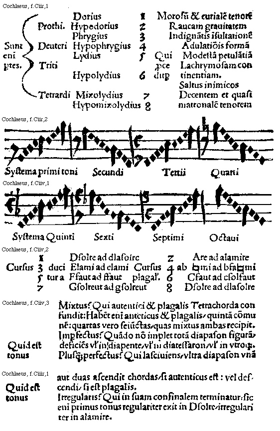 [Cochlaeus, f.Ciiv,3; text: Quid est tonus, Mixtus? Qui autentici et plagalis Tetrachorda confundit: Habent enim antenticus et plagalis, quintam communem: quartas vero seiunctas, quas mixtus ambas recipit. Imperfectus? Quando non implet totam diapason figuram, deficiens vel in diapente, vel in diatessaron, vel in vtroque. Plusquamperfectus? Qui lasciuiens, vltra diapason vnam] [COCTET3 01GF]