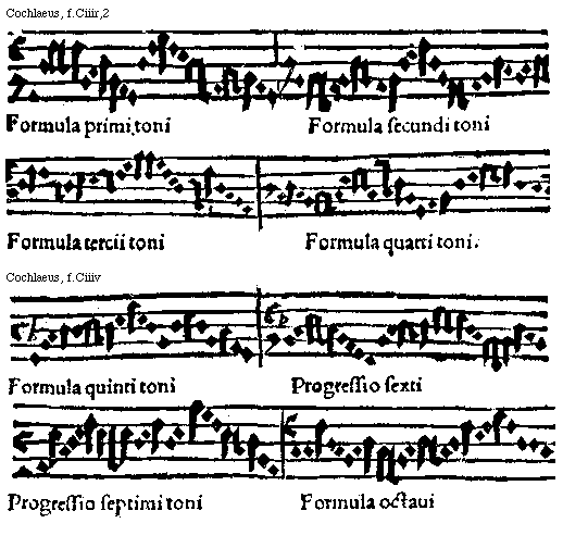 [Cochlaeus, f.Ciiir,2; text: Formula primi toni, Formula secundi toni, Formula tercii toni, Formula quarti toni.] [COCTET3 02GF]
