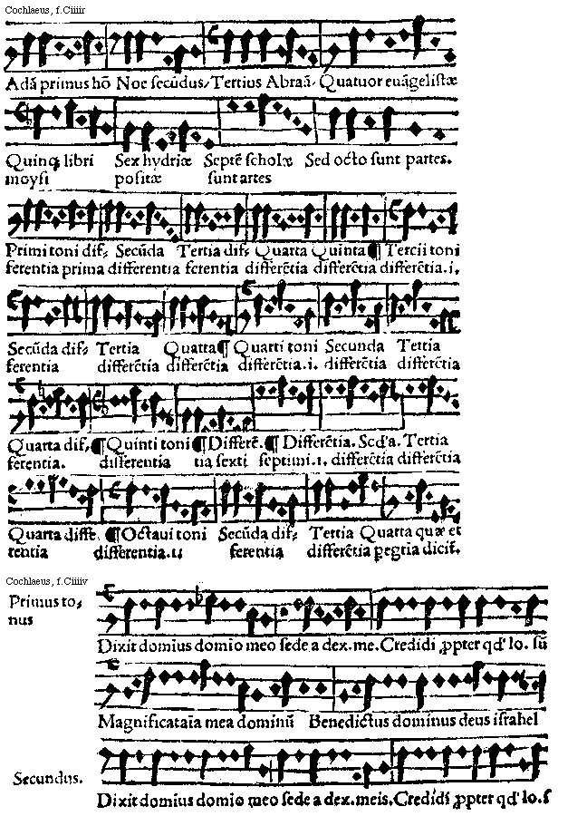 [Cochlaeus, f.Ciiiiv; text: Primus tonus. Dixit dominus domino meo sede a dextris meis. Credidi propter quod locutus sum, Magnificat anima mea dominum, Benedictus dominus deus Israhel, Secundus.] [COCTET3 03GF]