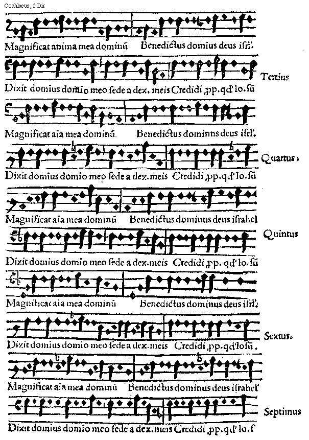 [f.Dir] [Cochlaeus, f.Dir; text: Magnificat anima mea dominum, Benedictus dominus deus Israhel. Tertius, Dixit dominus domino meo sede a dextris meis, Credidi propter quod locutus sum, Quartus. Quintus, Sextus. Septimus] [COCTET3 04GF]