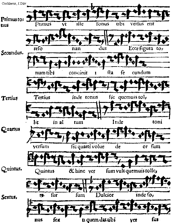 [Cochlaeus, f.Diiv; text: Primus tonus, Primus vt iste sonus tibi versus erit resonandus, Secundus. Ecce figura tonum tibi concinit ista secundum, Tertius, Tertius inde tonus sic quemuis tollit in altum, Quartus, Inde toni versum sic quarti volue deorsum, Quintus. Quintus et hinc versum vult quemuis tollere sursum, Sextus. Dulcior inde sonus sexti quem dat tibi versus] [COCTET3 07GF]