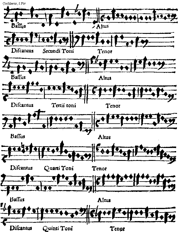 [f.Fiv] [Cochlaeus, f.Fiv; text: Bassus, Altus, Discantus Secundi Toni, Tenor, Discantus Tertii toni, Discantus Quarti Toni, Discantus Quinti Toni] [COCTET4 06GF]
