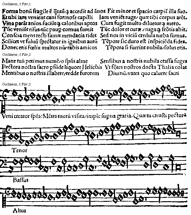 [Cochlaeus, f.Fiiv,3; text: Veni creator spiritus: Mentes tuorum visita, imple superna gratia. Quae tu creasti pectora, Tenor, Bassus, Altus] [COCTET4 08GF]