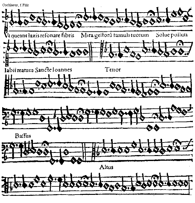 [Cochlaeus, f.Fiiir; text: Vt queant laxis resonare fibris Mira gestorum famuli tuorum Solue polluti labii reatum Sancte Ioannes, Tenor, Bassus, Altus] [COCTET4 09GF]