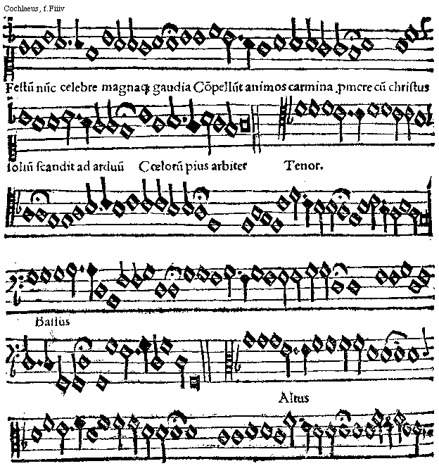 [Cochlaeus, f.Fiiiv; text: Festum nunc celebre magnaque gaudia Compellunt animos carmina promere cum Christus solium scandit ad arduum Coelorum pius arbiter, Tenor. Bassus, Altus] [COCTET4 10GF]