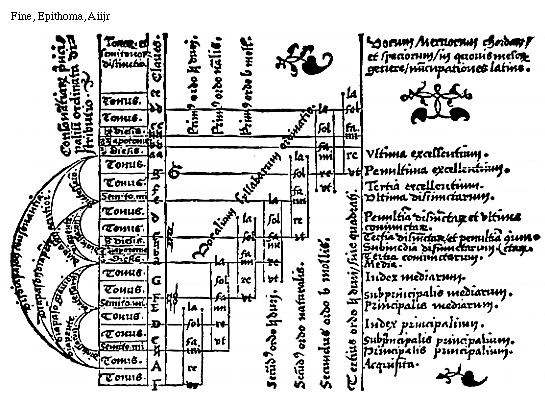 [Aiijr] [Fine, Epithoma, Aiijr; text: Consonantiarum principalium ordinata distributio. Claues. Primus ordo [sqb] durj. Primus ordo naturalis. Primus ordo [rob] mollis. Secundus ordo [sqb] durj. Secundus ordo naturalis. Secundus ordo [rob] mollis. Tertius ordo [sqb] durj, siue quadratj. Vocalium syllabarum ordinatio. Bisdiapason consonantia. Diapasondiapente. diapason grauior. diapason acutior. diapente. diatessaron. Tonorum, et semitonorum distinctio. Tonus. diesis. apotome. Semitonium minor. [Gamma], A, [sqb], C, D, E, F, G, a, b, c, d, e, f, g, aa, bb, [sqb][sqb], cc, dd, ee, vt, re, mi, fa, sol, la, Vocum, uernorum chordarum, et spaciorum, in quouis melorum genere, nuncupationes latine. Vltima excellentium. Penultima excellentium. Tertia excellentium. Ultima disiunctarum. Penultima disiunctarum et vltima coniunctarum. Tertia disiunctarum, et penultima coniunctarum. Submedia disiunctarum. Tertia coniunctarum. Media. Index mediarum. Subprincipalis mediarum. Principalis mediarum. Index principalium. Subprincipalis principalium. Principalis principalium. Acquisita.] [FINEPI 01GF]
