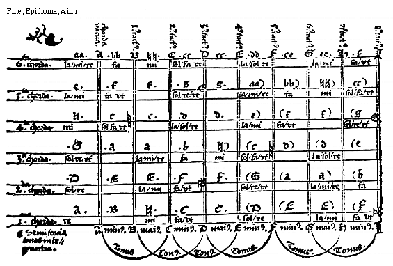 [Aiiijr] [Fine, Epithoma, Aiiijr; text: chorda uacua. primus tactus. secundus, tertius, quartus, quintus, sextus, septimus, octauus, Semitonia tonos integrantia. prima chorda. secunda, tertia, quarta, quinta, sexta, A, B, C, D, E, F, G, H, I, a, b, [sqb], c, d, e, f, g, aa, bb, [sqb][sqb], cc, dd, ee, re, mi, fa, fa/vt, sol/re, la/mi, sol/re/vt, la/mi/re, sol/fa/vt, la/sol/re, minus, maius, Tonus] [FINEPI 02GF]