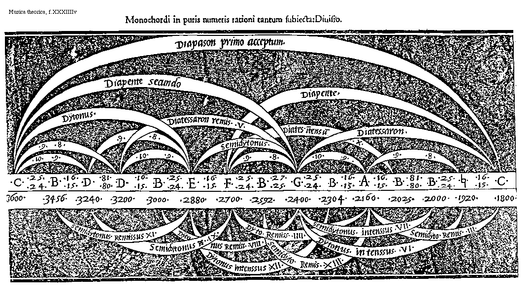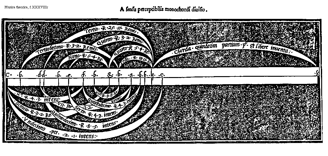 [f.XXXVIIIr] [Musica theorica, f.XXXVIIIr; text: A sensu perceptibilis monochordi diuisio. Tertio per 25, 15, Remissum, Tertiodecimo per 3, 2, Remissum, Quinto per 3, 2, Remissum, Quarto per 5, 4, Remissum, Secto per 18, 15, Remissum, Nono per 5, 4, Remissum, Chorda Quindecim partium primo et libere inuenta, c, b, dd, e, f, g, a, [sqb], k, Decimo per 4, 3, intensum, Septimo per 9, 8, Remissum, Quartodecimo per 4, 3, intensum, Septimo per 3, 2, remissum, sexto per 4, 3, intensum, octauo per 3, 2, Remissum, Quintodecimo per 8, 5, intensum, vndecimo per 2, 1, intensum] [FOLMUS3 03GF]