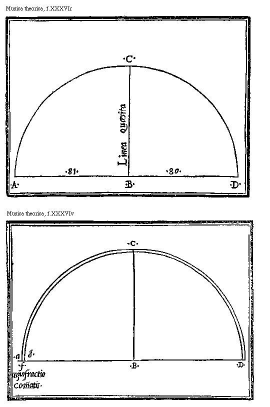 Qvoniam non est ponenda pluralitas sine necessitate: inquirendum est: an duo dsolre: et duo .b.mollia: necessarium sit ponere: Dicamus igitur: quod saltem apud speculatiuos musicos: qui ratione perpensa: quantuncunque minimam sonorum differentiam mediante numero quamsubtilissime rimantur: et cognoscunt: necessarium est: duo dsolre: et duo .b.mollia ponere: Dextrum scilicet et sinistrum: quia alias: plura sequerentur inconuenientia: quod probatur: nam dato solum .d. sinistro: tunc .g. prout aptum natum est esse extremum acutum consonantiae diapason: non haberet diatessaron ad complendam harmoniam ab ipso remissum: quam remissionem in d. practici terminare ponunt: propter quod necesse fuit: dextrum .d. ponere: dato uero .d. dextro tantum: tunc palam quod f faut: prout aptum natum est esse extremum acutum diapentes: non haberet semidytonum: ad complendam harmoniam ab ipso ad .d. remissum: Quare necesse fuit .d. sinistrum ponere: similia quoque sequuntur inconuenientia ex unius tantum .b.mollis positione: quippe dato sinistro .b.molli tantum: tunc gsolreut: prout aptum natum est esse medium harmonicum diapentes: non haberet ad complendam harmoniam: semidytonum ab ipso intensum et in .b. terminatum: cuius causa necesse fuit dare .b.molle dextrum: sed dextro tantum .b.molli dato: tunc f faut prout aptum natum est esse medium harmonicum consonantiae diapason: non haberet ad complendam harmoniam diatessaron ab ipso intensum: et in .b. ut practicorum mos requirit: terminatum: propter quod .b. sinistrum ponere oportet: et tota causa eorum quae diximus est: quia nulla consonantia in monochordo: quae per unum illorum terminatur: potest ab alio perfecte terminari: et per consequens duo .d. et duo .b. necesse fuit ponere: ut omnes [f.XXXVv] consonantiae suam habeant perfectionem: Sed musici practici: illi scilicet qui artificialibus instrumentis musicam exercent: quum sint artifices sensitiui aurium iudicio sine ulteriori ratione: contenti: ad euitandam pluralitatem per unum tantum .d. et per unum tantum .b. praedicta conantur euitare inconuenientia: Intelligo autem per unum tantum .d: et per unum tantum .b. non dextrum aut sinistrum: sed inter utrunque medium: potens utriusque scilicet dextri et sinistri fungi officio quod licet aliqualiter imperfecte fiat: citra tamen aurium displicentiam: hoc fieri contingit: Tale autem .d. uel .b. medium: nihil aliud est, quam punctus in duas medietates proportionem commatis diuidens: ac representans sonum: qui efficitur terminus communis omnium consonantiarum: quae prius secundum suas perfectiones: partim ad unum .d. uel .b. et partim ad aliud .d. uel .b. terminabantur: qui terminus communis: facit: quod unaquaeque talium consonantiarum augeatur: uel diminuatur a sua perfectione per dimidium commatis: ita tamen quod per talem augumentationem uel diminutionem: quam ipsi participationem uocant: nulla consonantia in tantum a propria forma discedit: quod aures illam pati non possint: nam experientia compertum est: quod dimidium commatis alicui consonantiae additum uel ablatum: adhuc illam relinquit: consonantiam auribus tolerabilem: totius uero commatis additio uel remotio: nequaquam est tolerabilis: ex quo sequitur quod nullum .d. uel .b. siue dextrum siue sinistrum solitarie acceptum potest pro .d. uel .b. practicorum supplere: quia tunc totum comma adderetur: quod aggregatum aures minime patiuntur: idem dico de diminutione totius commatis ab aliqua consonantia. At musici practici: quum nihil omnino sciant de commate: nec quod talis augumentatio uel diminutio fiat per dimidietatem commatis, quum talia scire et speculari sit proprium Theorici musici: quomodo per sensum uenantur illud medium punctum participationis? Dico quod practici artificialibus instrumentis musicam exercentes: tunc illud medium punctum attingunt: quum per uariam saepiusque mutatam chordarum intensionem et remissionem: tandem obtinuerint: quod omnes consonantiae a sono illius puncti medii terminatae, seinuicem secundum harmoniam compatiantur: hoc est, quod una illarum in tantum non accedat ad perfectionem: quod alia sic derelinquatur imperfecta: quod auribus sit omnino intolerabilis: sed oportet imperfectionem ab omnibus equaliter participari: ut omnes sint tolerabiles, modo praeexposito. Hanc uero participationem, si forte musicus speculatiuus demonstratiue cognoscere contendat, id nisi proprios transgrediatur limites nequaquam consequi poterit: et ratio est, quia haec participatio: non est de eius consideratione: tum quia ipse examussim consonantias secundum ultimas earum perfectiones, perpendit: nullam omnino de participatis et imperfectis habens solicitudinem: tum quia huiuscemodi participatio per principia huius scientiae: quae sunt arithmeticae conclusiones: minime sciri potest: quippe commatis in duas partes aequales sectio: quae participationis est causa: frustra in puris queritur numeris: quum nulla superparticularis proportio secundum terminos arithmeticos in duo aequalia recipiat sectionem: ut patet discurrenti: sed in continuis oportet illud indagare. Nostras igitur ad praesens parumper metas exeuntes uberioris doctrinae gratia: hanc commatis sectionem: et per consequens participationem: geometrice demonstrare tentabimus. Accipiamus primo duas [f.XXXVIr] lineas: quarum altera in .81. partes: et altera in .80. tantum diuisa sit: et prima uocetur .a.b. et secunda .b.d. quibus adinuicem secundum rectitudinem coniunctis: resultabit una totalis linea ex ambabus composita .a.d. super quam totam descripto semicirculo: si a puncto .b. lineae totalis: usque ad circunferentiam iam descripti semicirculi: lineam perpendicularem .b.c. uocatam duxerimus: tunc talis linea erit linea quaesita: ad quam scilicet .a.b. in eadem proportione se habet: in qua illamet se habet ad .b.d. ut patet per nonam sexti Euclidis: quae duae proportiones non denominantur ab aliquo numero: quum sint irrationales et surdae, et sic in duas partes aequales comma diuiditur: quam quidem partitionem per modum exempli tantum h