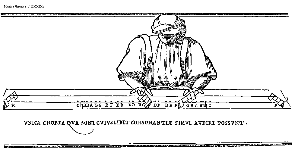 [f.XXXIXr] [Musica theorica, f.XXXIXr; text: A, B, [sqb], C, D, E, F, G, K, Vnica chorda qva soni cvivslibet consonantiae simvl avdiri possvnt.] [FOLMUS3 04GF]