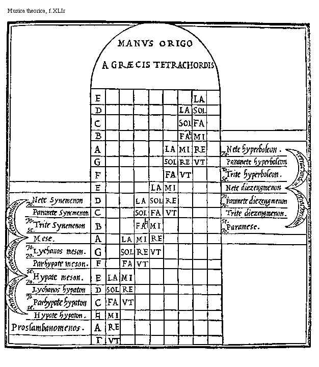 [f.XLIr] [Musica theorica, f.XLIr; text: Manvs origo a graecis tetrachordis, E la, D la sol, C sol fa, B fa[sqb] mi, A la mi re, G sol re vt, F fa vt, E la mi, D la sol re, C sol fa vt, B fa[sqb]mi, A la mi re, G sol re vt, F fa vt, E la mi, D sol re, C fa vt, [sqb] mi, A re, [Gamma] vt, Tetrachordum, Nete Synemenon, Tonus, Paranete Synemenon, Trite Synemenon, Semitonium, Mese. Lychanos meson. Parhypate meson. Hypate meson. Lychanos hypaton, Parhypate hypaton, Hypate hypaton. Proslambanomenos. Nete hyperboleon, Paranete hyperboleon, Paranete hyperboleon, Trite hyperboleon. Nete diezeugmenon, Paranete diezeugmenon, Trite diezeugmenon, Paramese.] [FOLMUS3 05GF]