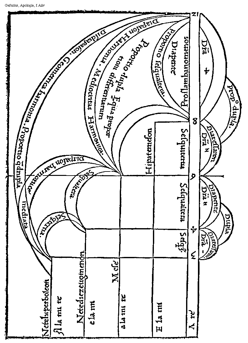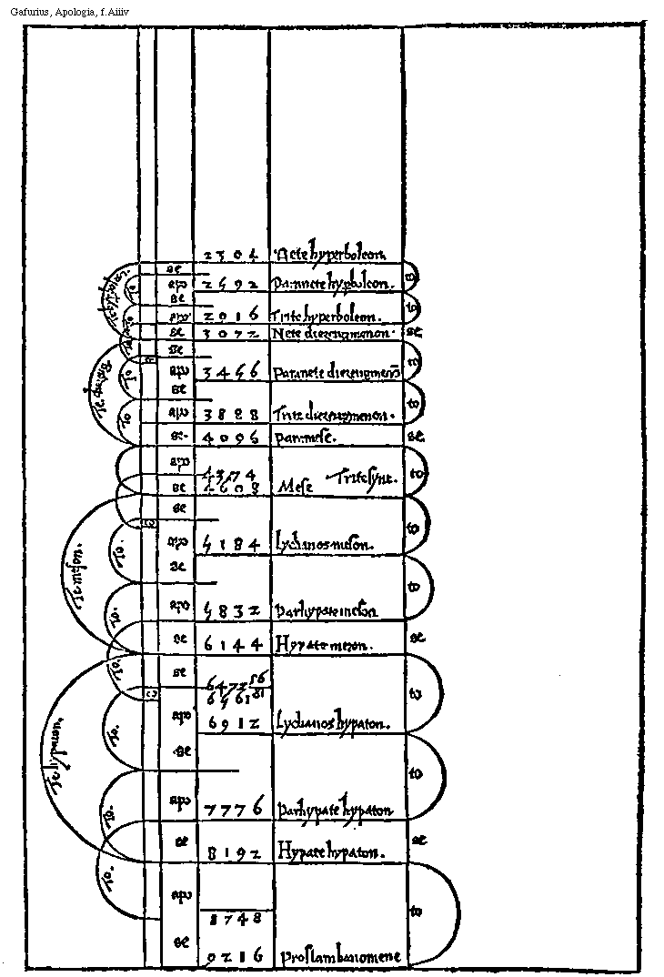 [Gafurius, Apologia, f.Aiiiv; text: Tetrachordon hypaton. Tetrachordon meson. Tetrachordon diezeugmenon. Tetrachordon hyperboleon. Tonus, semitonium, apothome, 2304, 2592, 2916, 3072, 3456, 3888, 4096, 4374, 4608, 5184, 5832, 6144, 6473, 56, 6561, 81, 6912, 7776, 8192, 8748, 9216, Nete hyperboleon. Paranete hyperboleon. Trite hyperboleon. Nete diezeugmenon. Paranete diezeugmenon, Trite diezeugmenon. Paramese. Trite synemenon. Mese, Lychanos meson. Parhypate meson. Hypate meson. Lychanos hypaton. Parhypate hypaton, Hypate hypaton. Proslambonomene] [GAFAPO 03GF]