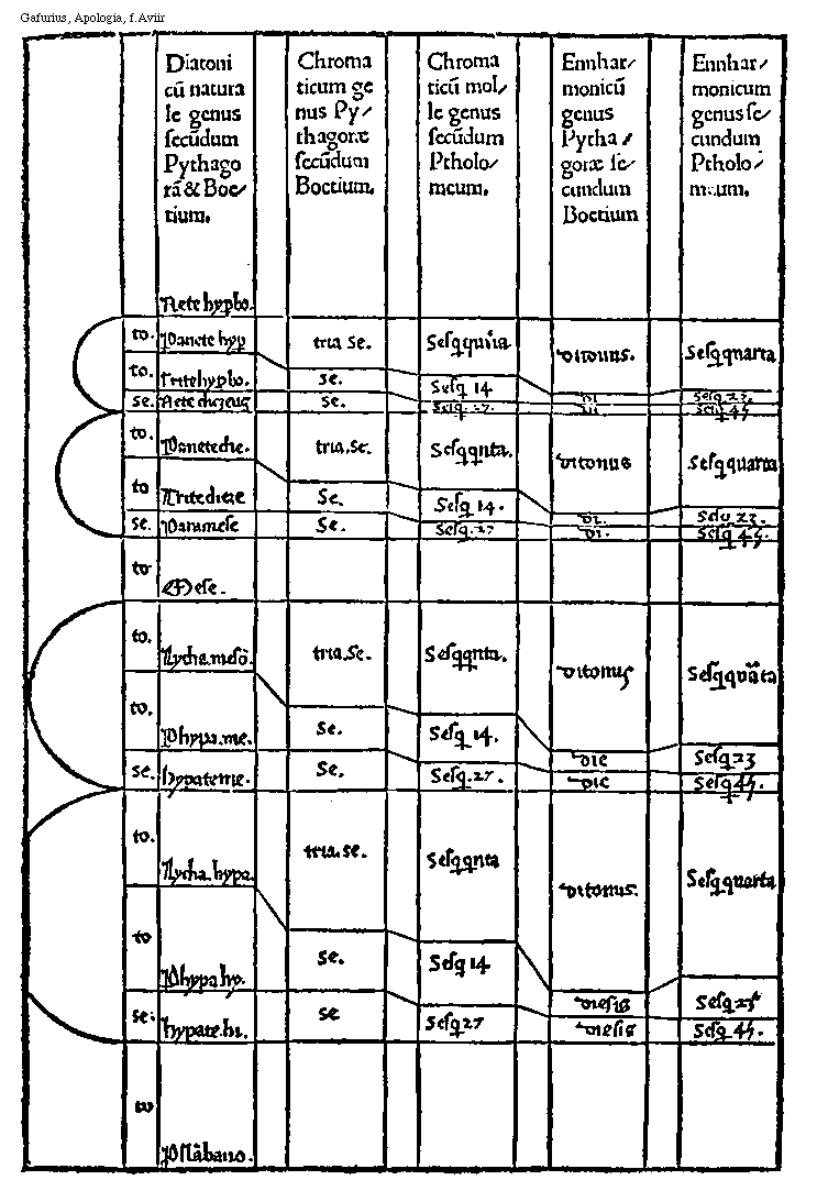 [f.Aviir] [Gafurius, Apologia, f.Aviir; text: Diatonicum naturale genus secundum Pythagoram et Boetium. Chromaticum genus Pythagorae secundum Boetium. Chromaticum molle genus secundum Ptholomeum. Ennharmonicum genus Pythagorae secundum Boetium, Ennharmonicum genus secundum Ptholomeum. tonus, semitonium, Nete hyperboleon, Paranete hyperboleon, Trite hyperboleon, Nete diezeugmenon, Paranete diezeugmenon, Trite diezeugmenon, Paramese, Mese, Lychanos meson, Parhypate meson, Hypate meson, Lychanos hypaton, Parhypate hypaton, Hypate hypaton, Proslambonomenos, tria semitonia, sesquiquinta, sesquidecimaquarta, sesquiuigesimaseptima, ditonus, diesis, sesquiquarta, sesquiuigesimatertia, sesquiquadragesimaquinta] [GAFAPO 05GF]