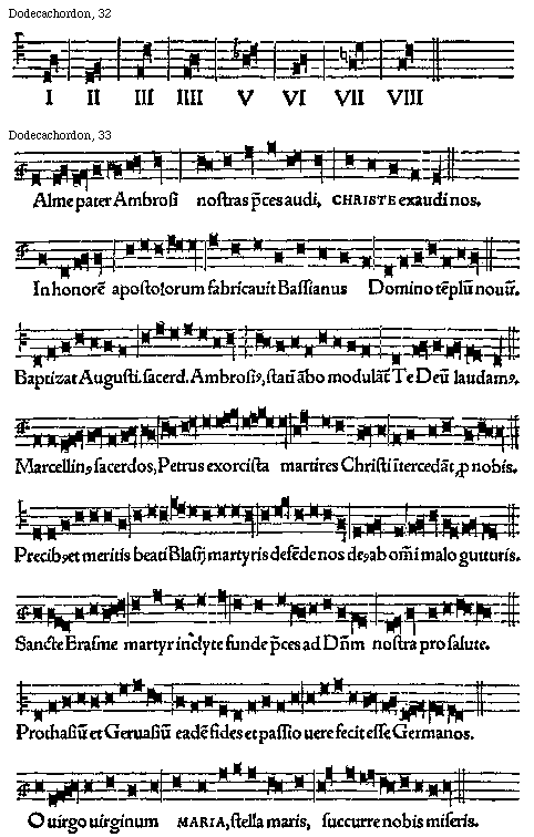 [33] [Dodecachordon, 33; text: Alme pater Ambrosi nostras preces audi, Christe exaudi nos. In honorem apostolorum fabricauit Bassianius Domino templum nouum. Baptizat Augustinum sacerdos Ambrosius, statim ambo modulantur Te Deum laudamus. Marcellinus sacerdos, Petrus exorcista martires Christi intercedant pro nobis. Precibus et meritis beati Blasij martyris defende nos deus ab omni malo gutturis. Sancte Erasme martyr inclyte funde preces ad Dominum nostra pro salute. Prothasium et Geruasium eadem fides et passio uere fecit esse Germanos. O uirgo uirginum Maria, stella maris, succurre nobis miseris.] [GLADOD1 11GF]