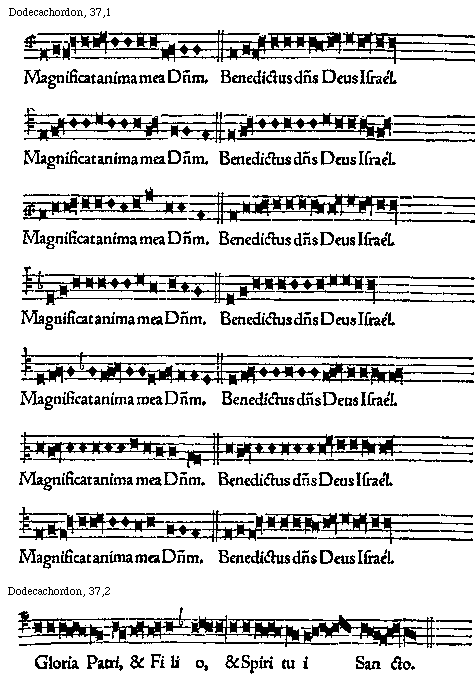 [37] [Dodecachordon, 37,1; text: Magnificat anima mea Dominum. Benedictus dominus Deus Israel.] [GLADOD1 13GF]