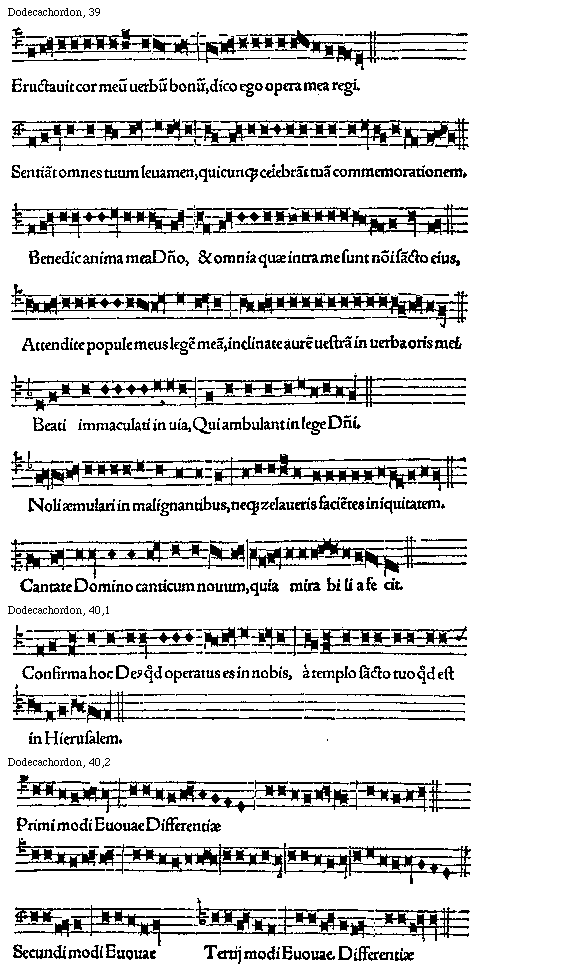 [Dodecachordon, 39; text: Eructauit cor meum uerbum bonum, dico ego opera mea regi. Sentiant omnes tuum leuamen, quicunque celebrant tuam commemorationem. Benedic anima mea Domino, et omnia quae intra me sunt nomini sancto eius, Attendite popule meus legem meam, inclinate aurem uestram in uerba oris mei. Beati immaculati in uia, Qui ambulant in lege Domini. Noli aemulari in malignantibus, neque zelaueris facientes iniquitatem. Cantate Domino canticum nouum, quia mirabilia fecit.] [GLADOD1 15GF]